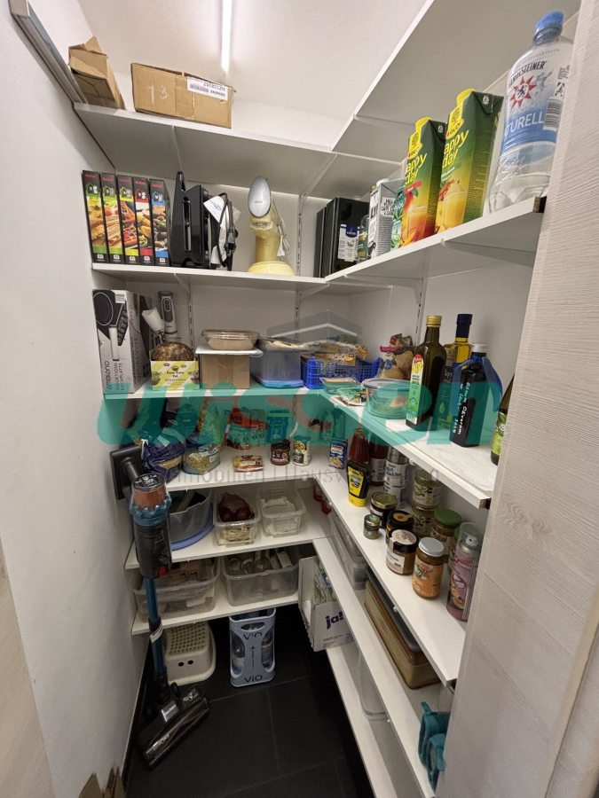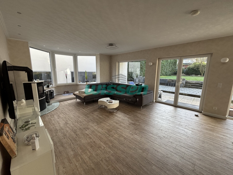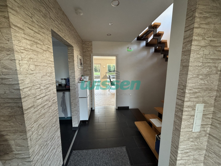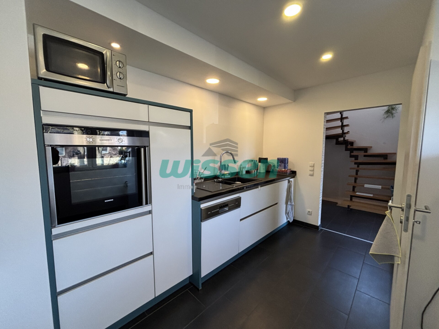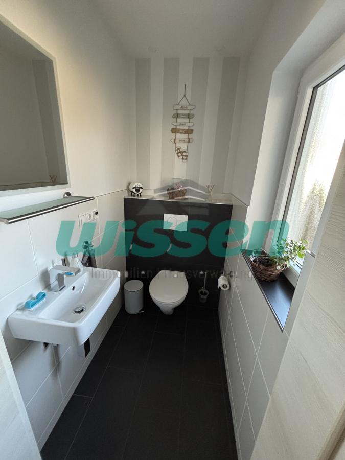 Der großzügig gestaltete Wohnbereich im Erdgeschoss bildet das kommunikative Zentrum des Hauses. Von hier aus eröffnet sich der Zugang zur weitläufigen Terrasse mit Blick in den gepflegten Garten, wodurch ein harmonischer Übergang zwischen Innen- und Außenbereich entsteht. Die modern ausgestattete Küche mit separater Speisekammer sorgt für optimale Arbeitsabläufe und zusätzlichen Stauraum. Ein Gäste-WC ergänzt das Raumangebot auf dieser Ebene.