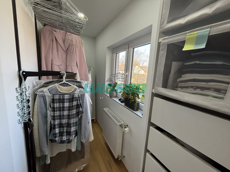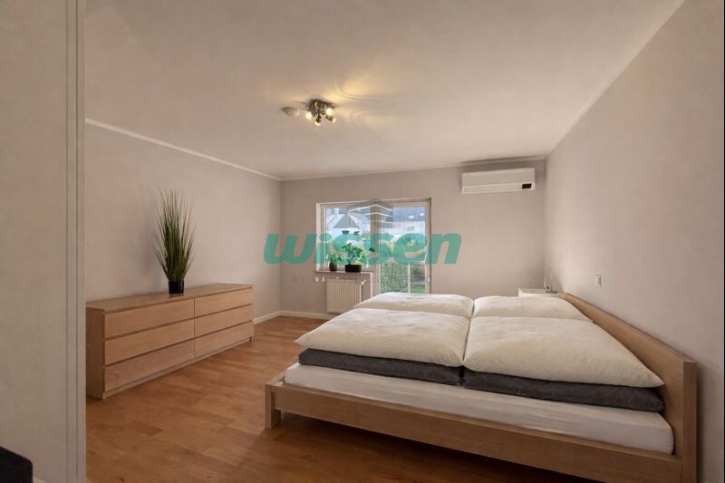 Im Obergeschoss befinden sich das zentrale Schlafzimmer, ein angrenzendes Ankleidezimmer sowie ein weiteres Schlafzimmer. Das großflächige Duschbad ist mit einer komfortablen Fußbodenheizung ausgestattet und bietet eine hochwertige Sanitär- und Ausstattungslinie. Diese Etage dient als ruhige Wohnzone mit idealer Raumverteilung für Familien.