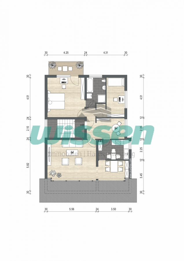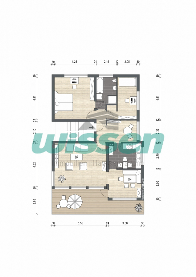 Die Untergeschosswohnung bietet eine Terrasse, während die Wohnungen im Erd- und Dachgeschoss jeweils über einen Balkon verfügen.