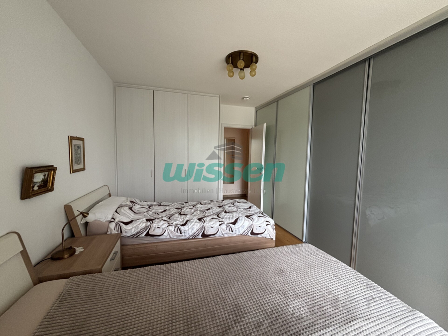 Das ruhig gelegene Schlafzimmer ist ebenfalls mit einem praktischen Einbauschrank ausgestattet und verfügt über einen französischen Balkon in Ost-Ausrichtung, so starten Sie mit der Morgensonne in den Tag.