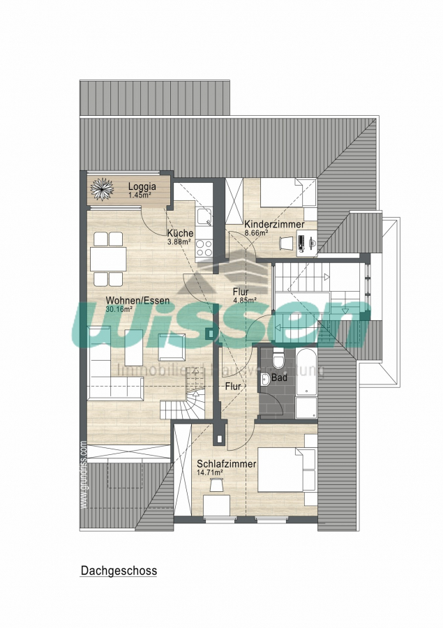 Der Wohn- und Essbereich ist offen gehalten, die Küche lässt sich als Zeile planen. Vom Wohnzimmer hat man sowohl Zugang zur Loggia als auch über eine Treppe zum Spitzboden mit Dachfenster.
